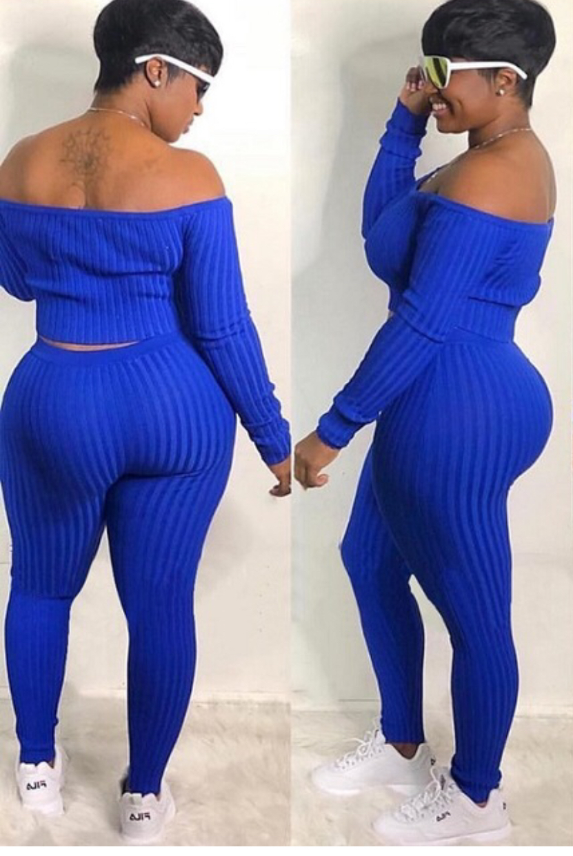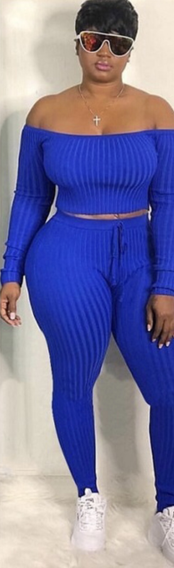 This blue 2 pc set. Is a cotton blend has a little stretch in the top and medium stretch in the pants. You will absolutely love this off the shoulder look.